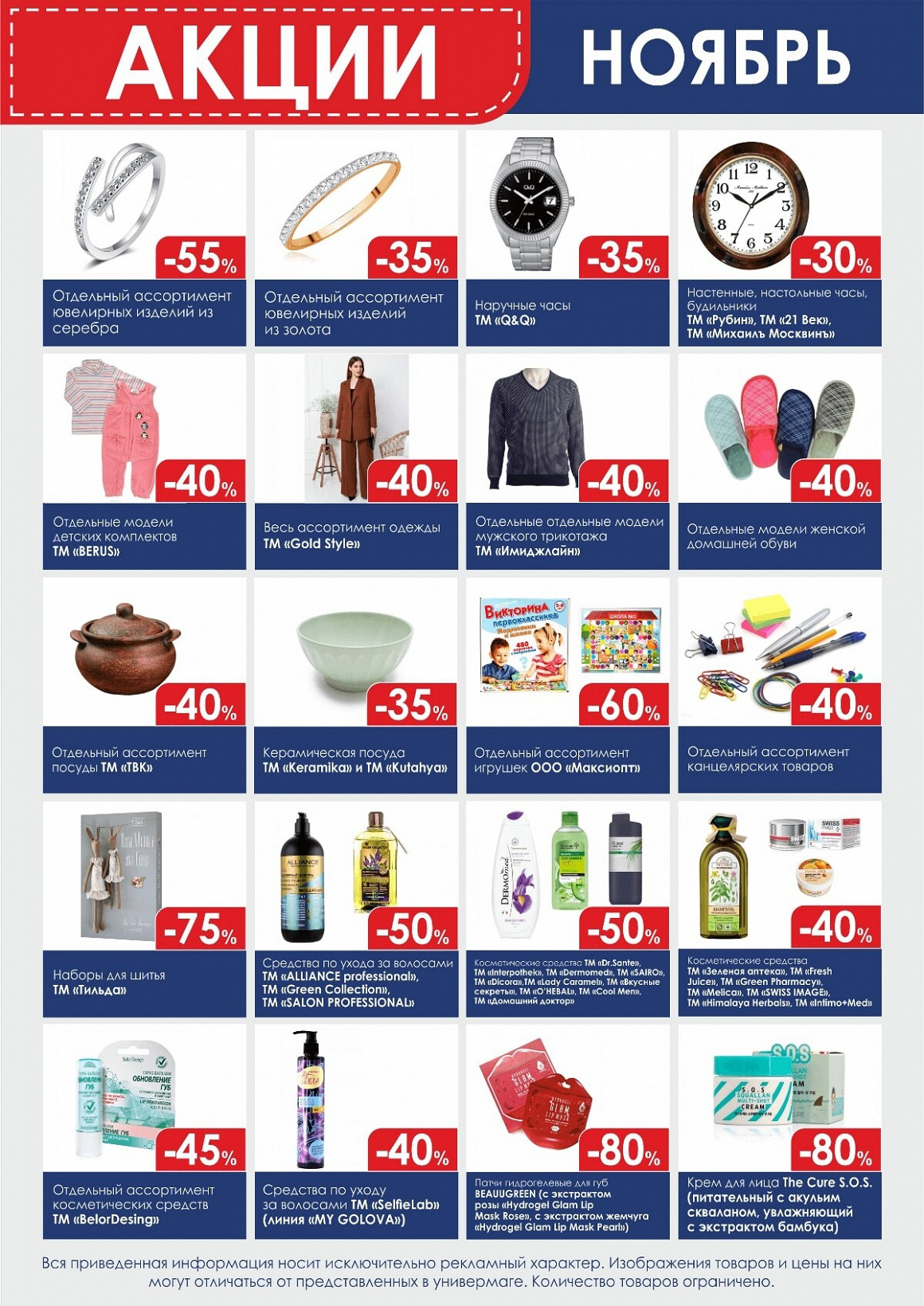 2, 9, 16, 23 и 30 ноября – для всех покупателей скидка 30% на непродовольственные товары, скидка 5% на продовольственные товары (акция “Скидки для всех”).
